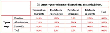 Como se refleja en la tabla, existe una porcentaje de los directivos y administrativos, que consideran que requieren de mayor autonomía, lo cual se presenta en una mayor proporción entre los administrativos. Por tal razón, dentro del mismo análisis, se miraría más adelante, que características sociodemográficas “¿Quiénes son?” tienen estos empleados, para analizar los perfiles de cargo respectivos y hacer los cambios del caso y la reinducción respectiva.